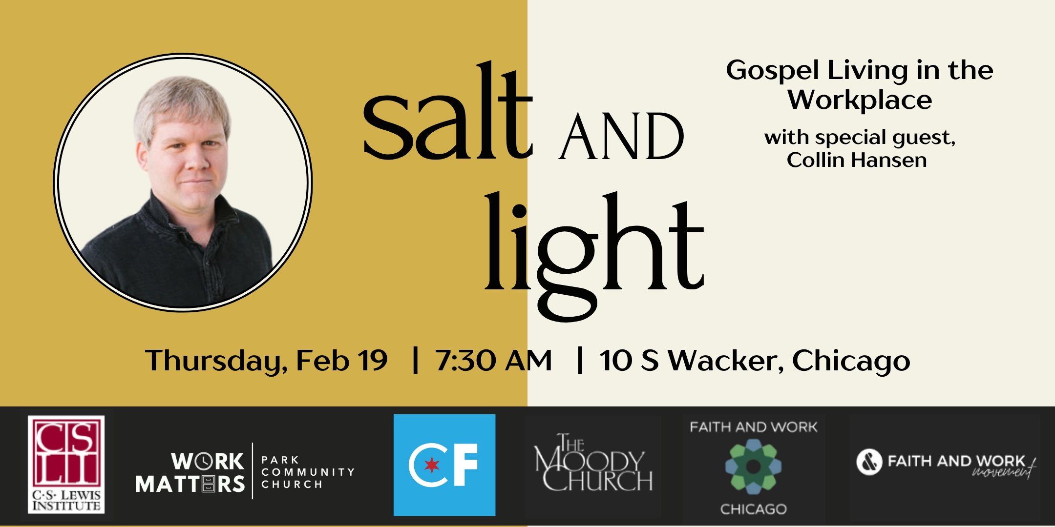 Join us for a unique Salt and Light gathering as we partner with the Chicago Fellowship (CF) and other faith & work organizations in the city for a special event! We look forward to welcoming Collin Hansen, the VP for content and editor-in-chief of The Gospel Coalition and the executive director of The Keller Center for Cultural Apologetics, and we have invited the Chicago Fellowship to join us.